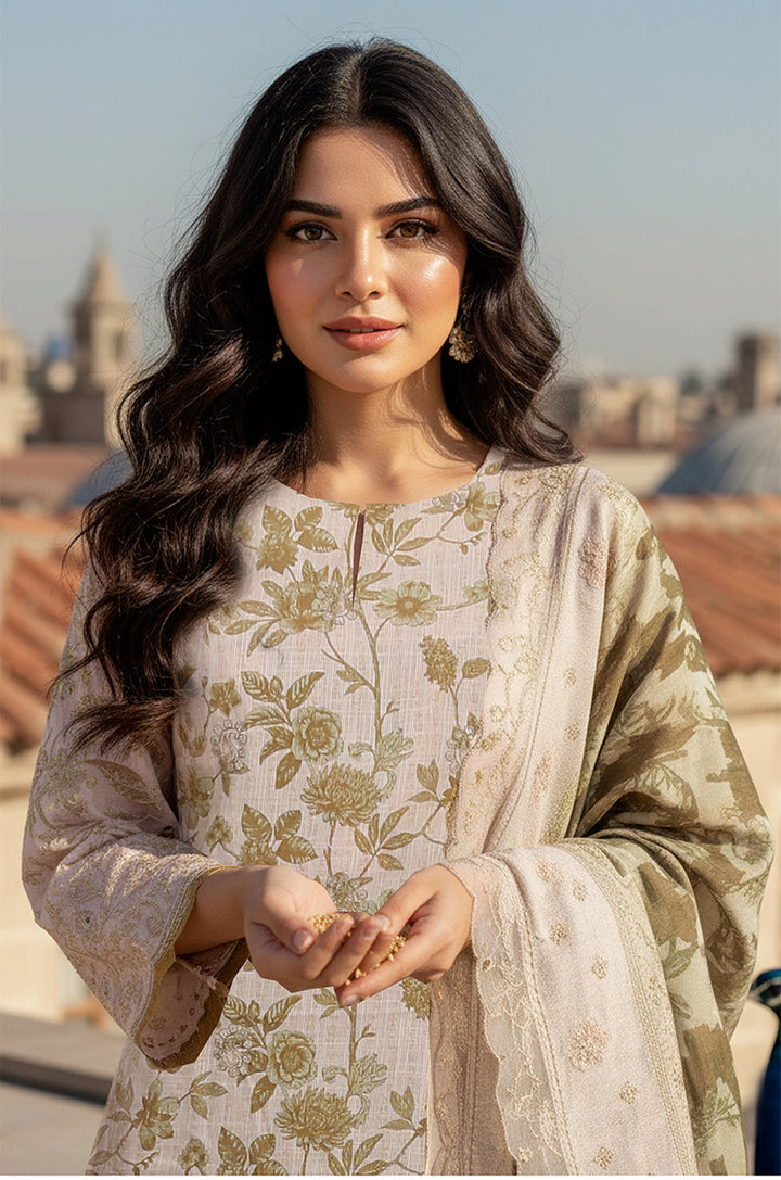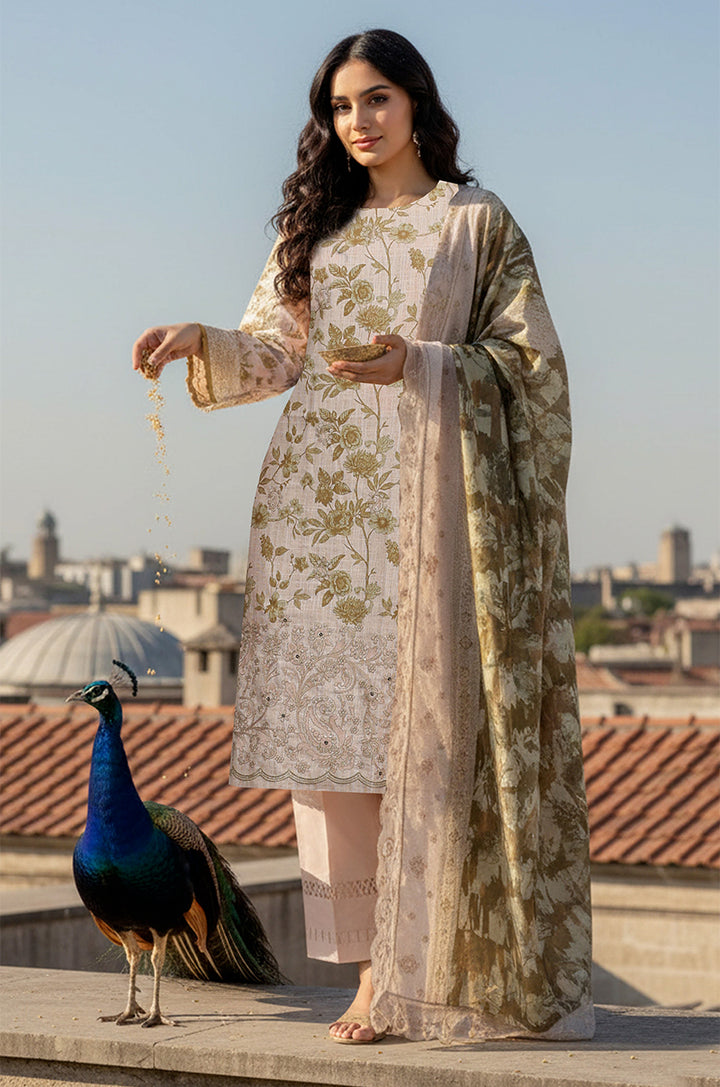 DUPATTA: 4SIDE ATTACHED LACE EMB & PRINTTED KHADAR DUPATA