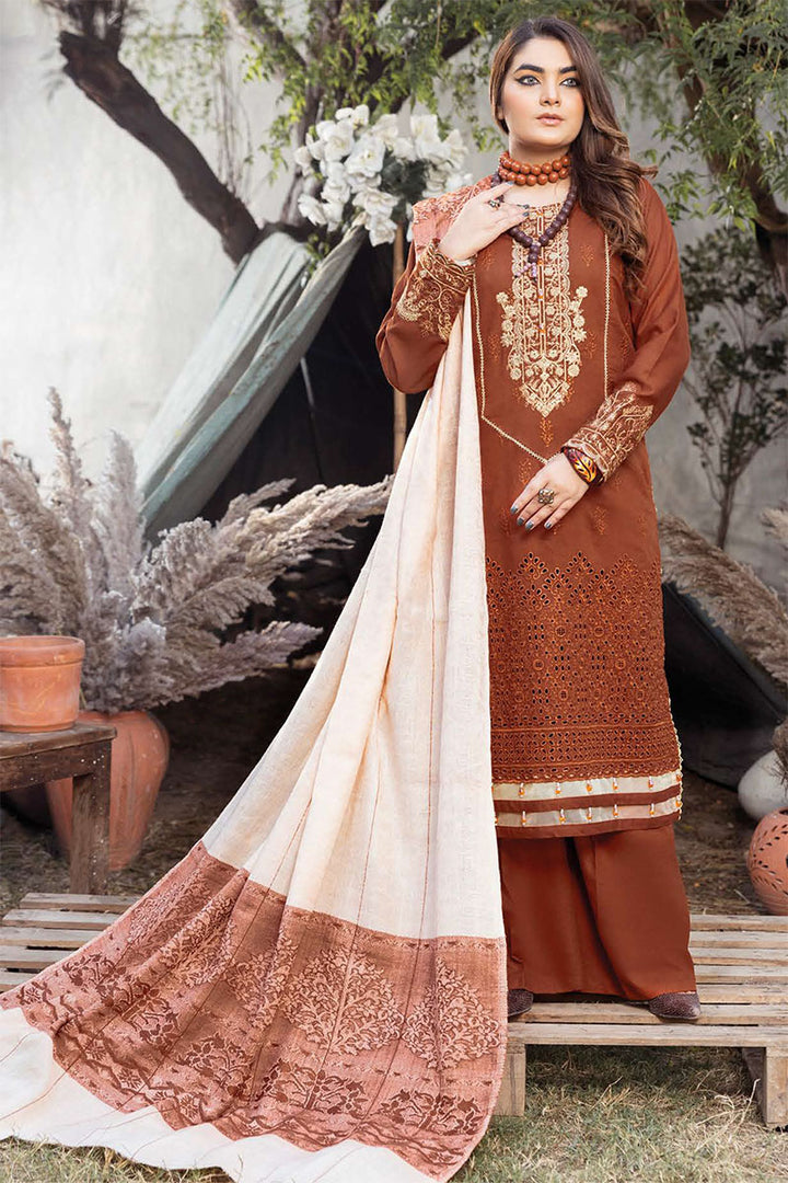 SHIRT YUDIYA KARANDI FRONT BACK AND SLEEVES EMBROIDERY BROSHA PALLU SHAWL AND WITH DIED PLAIN TROUSER