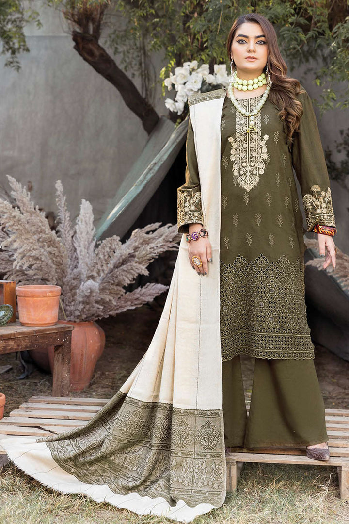 SHIRT YUDIYA KARANDI FRONT BACK AND SLEEVES EMBROIDERY BROSHA PALLU SHAWL AND WITH DIED PLAIN TROUSER